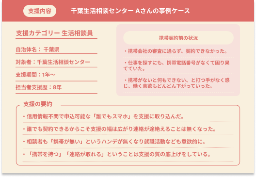 千葉県で多様な方々の相談支援を行うAさんも、相談者の3割が携帯電話を持っていない、あるいは滞納で使えないという状況に直面し、支援が中断することに悩んでいました。